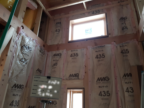 壁は安価なグラスウール16kの100mmを使用しています。壁の断熱材はグラスウールよりも、もっと性能の良い製品が出回っています。予算に余裕のある方は、もっと性能の良い断熱材を使用されると良いですが、壁に関しては、16kで100mmほどの厚さがあれば、グラスウールでも、十分効果を発揮します。