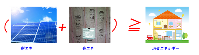 この家は、ZEH申請を行っています。ZEHとは、上記画像が示す様に、創り出すエネルギーと、一般的な住宅より省エネ技術で抑える事の出来たエネルギーの総和が、一般的な同規模の住宅が消費するエネルギー量を上回る住宅を云います。