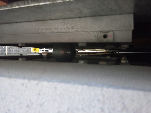 その固定装置が写真の風揺れ固定装置です。完全な機械式の固定装置で、動力を必要としません。地震の横揺れのみ感知して、安全装置が解除され、免震する様になっています。