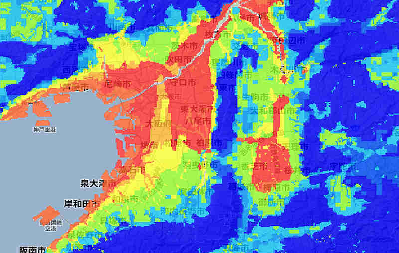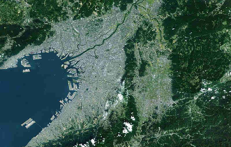 上の画像は、大阪平野を中心に大阪近辺を宇宙から見たものです。