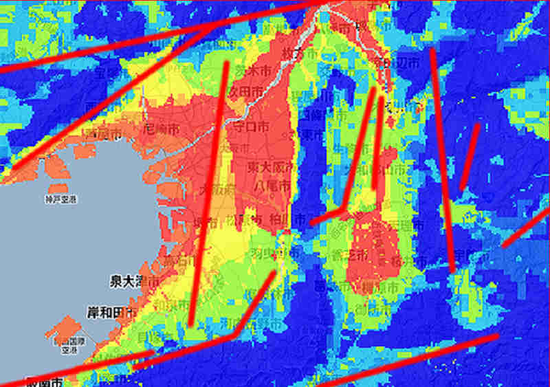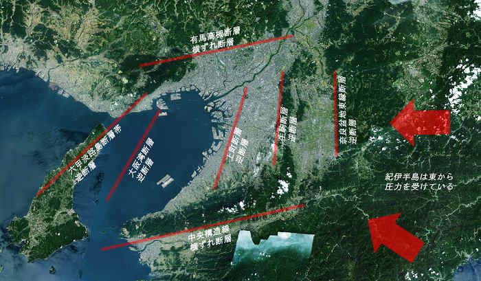 大阪平野を中心に東は奈良盆地の東端から、西は淡路島まで、南北方向に五本の活断層が確認されています。この五本全てが逆断層で、東側の地盤が西側の地盤に乗り上げる様に、ズレています。つまり、赤い矢印の様に、紀伊半島全体が東側から押されているのです。