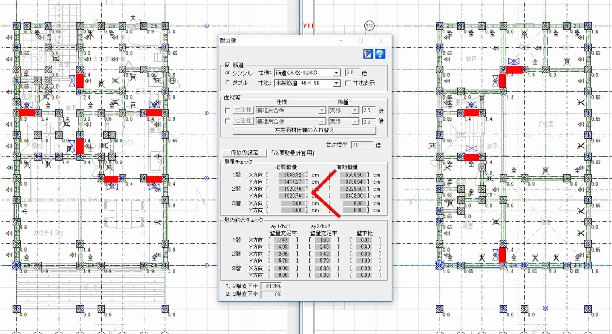 上記画像は、木構造の簡易法である「筋交い計算」によって、必要な耐力壁を算定した画像で、赤色の部分が筋交いの位置を示しています。一階で6か所二階5か所の筋交いが必要と云う結果になっていますが、これを詳細法である、「構造計算(許容応力度計算)」によって検証しますと下図のようになります。