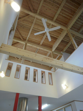 難色を示していると「以前に吹き抜けのある家を造ったことがあるので見に行きませんか?」と誘われました。日を置かず見学させて頂くと、その家にはリビングの中央に6帖ほどの吹き抜けがあり、優雅に天井扇が回っていました。一階と二階の温度差が無いのに驚き、その家のご主人に尋ねてみると、床下から天井裏までパイプを通して空気を循環させているとの事でした。次世代省エネ基準と云う基準をクリアしているそうで、月平均の光熱費は以前の住宅に比べ、1万円以上下がっているとの事でした。これなら、吹き抜けを造っても光熱費を気にする必要はありません。そこで福味さんに、一階も二階も家全体がワンルームになる様な家を希望しました。