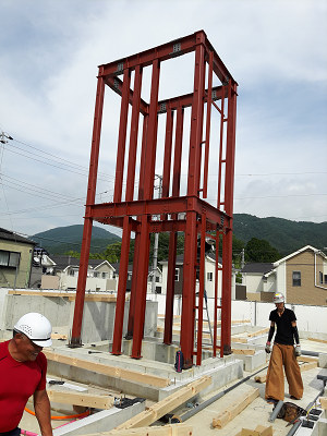 規模が大きい分上棟作業に二日間を要しましたが、内容は在来の木造と何ら変わる事はありません。木造の住宅等に比べて間取り構成が単純な分、作業効率は上がります。