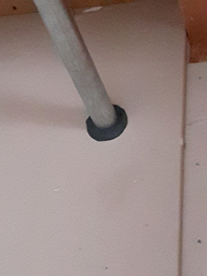 木造の構造体は、完全に石膏ボードで被覆されていなければなりません。しかし、どうしても被覆を貫通しなければならない設備配管も出て来ます。その様な場合はRC造の区画貫通と同様の処置を行います。こういった作業が在来の木造建築物と異なる作業です。