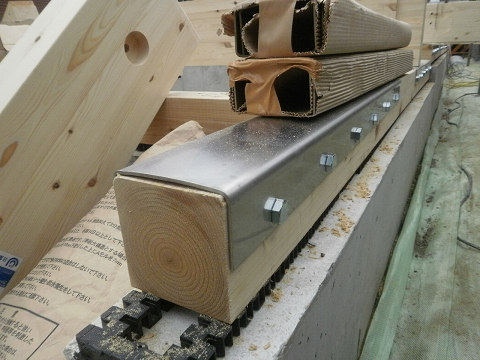 一般的な木造住宅は、土台の上に柱を取り付けて、建物を組み上げて行きますが、滑り免震住宅は、土台の上に木製架台を設け、その架台に柱を立てて行きます。