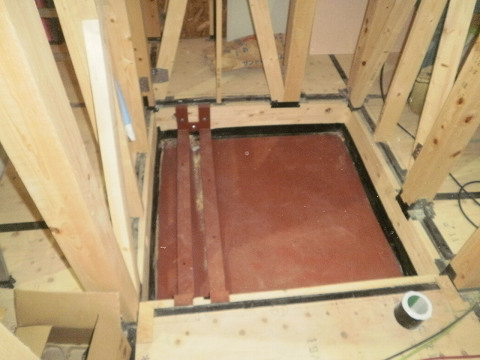 しかし、免震住宅では、コンクリート製のピットを設けても、エレベーターを据える事が出来ません。建物が免震すれば、エレベーターと衝突してしまう為です。パナソニックよりピット深さが200mmと云う極浅のホームエレベータが出されていましたので、それを利用して、木製架台の中にエレベーターピットを納めています。勿論コンクリート製にする訳にはいかず、鉄板でピットの床を作っています。