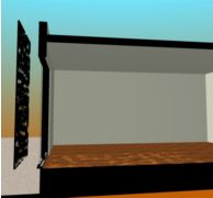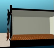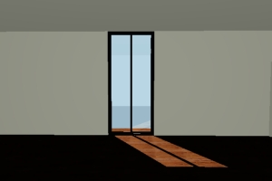 ![]() | 夏季 太陽が正午前後に南中した画像です。掃き出し窓から入って来る日差しは、あまり多くなく、庇等を施せば、室温を抑えられる事が分かります。 |