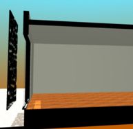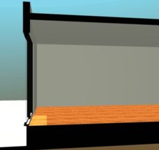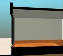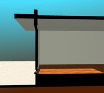 | 右の図は、床面から2.4mの高さに、出幅1mの庇を設けた時の、夏至の日差しを再現しました。 大阪の夏至の日の南中時の太陽高度は約78°です。お盆前後は63°付近まで下がってます。 丁度、この庇の角度が63°程度になります。 お盆前後でも、ほぼ窓際で止まります。 |