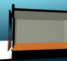 | 下図は同様の冬至の日差しです。 南回帰線は-23°30′ですから90-(35+23)=32°となりますので、窓上の壁の部分に影は出来ますが、ほぼ庇の無い場合と同様の位置まで日差しが入り込んでいます。 |