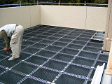 耐根シート貼 土が流れ落ちるのと、根による防水層の劣化を防ぐ目的で耐根シートを貼ります。 |